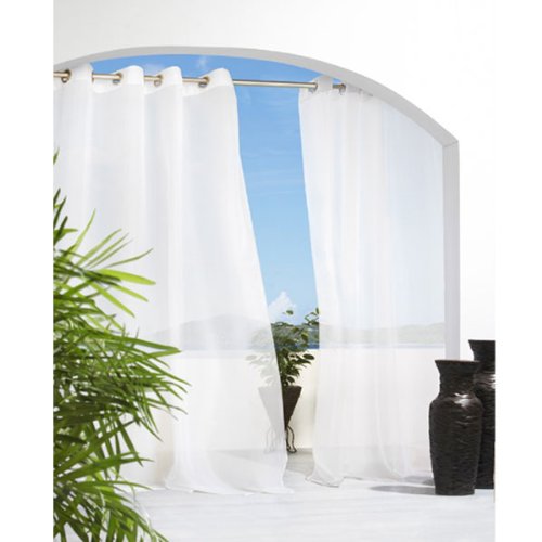 Beautiful outdoor white sheer curtain panel features silver grommets for easy installation. 100% polyester. Available in 54" x 84" and 54" x 96"