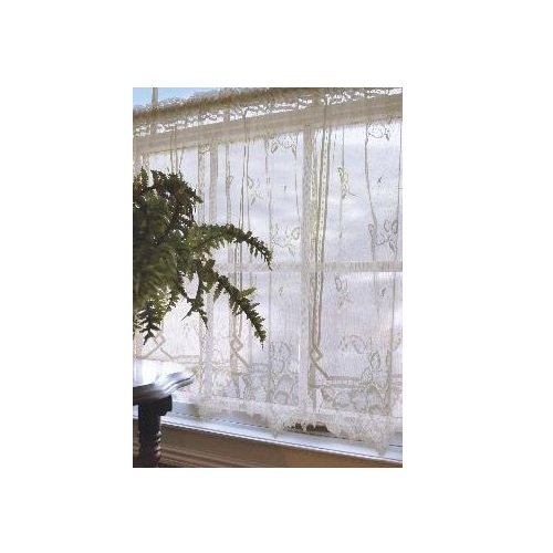 Heirloom 60-inch wide by 30-inch drop White Sheer Tier that has a timeless look - fabric artfully edged with intricate floral elements and deep-cut, leafy edging and scallops. Includes a 1-inch Header and a 1-1/2-inch Rod pocket in stated dimensions.