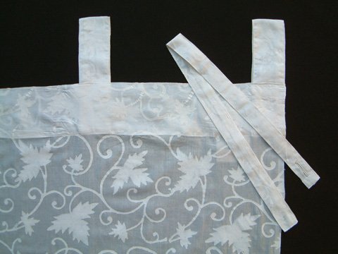 These are beautiful curtains. The fabric is soft and fine. It diffuses light and is not very heavy, yet still affords privacy. They look handmade, with lovely block printing in creamy white on a creamy white background. The color is just slightly off-white, a very light color but not stark white. The look reminds me of a soft, beautiful sundress.