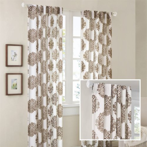 Traditional damask design is created by using special "burnout "process to create the sheer medallion motif floating on a lightweight semi sheer linen ground. Creamy ivory linen ground color with the color accented in the burn out medallion gives a subtle touch of color to the room. Panels can be hung two ways either with the 3" rod pocket or with the hidden 3" wide back tabs. Both can accommodate either a standard or decorative drapery rod. Single, wide with panel measures an ample 52" wide. 60% Rayon 40% polyester burnout, rod pocket, back tab