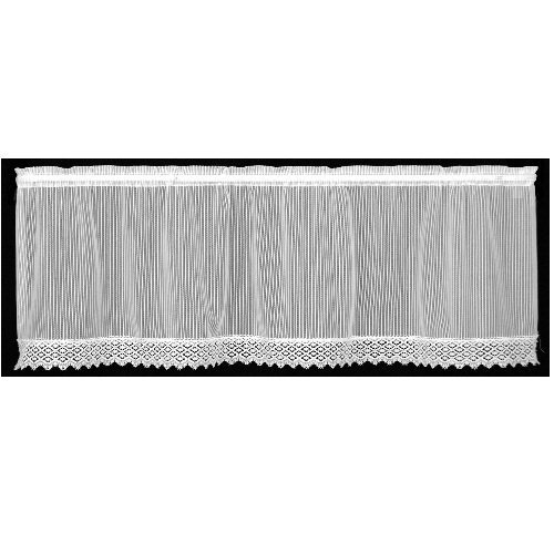 Chelsea 48-inch wide by 30-inch drop White Tier with Trim has a crisp, clean look of pinstripes, made even more inviting with lace trim. Includes 1-inch header, 1-1/2-inch rod pocket, and 3-3/4-inch Hem trim in the stated dimensions.