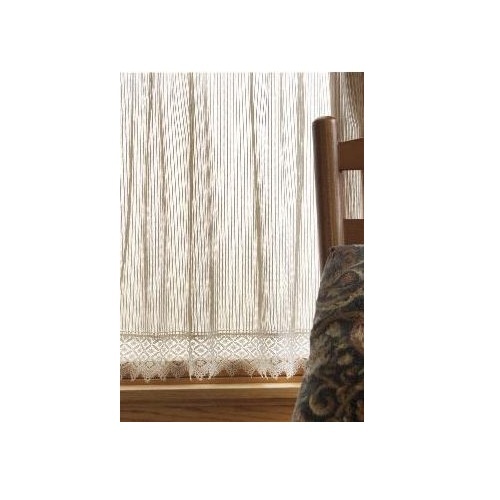 Chelsea 48-inch wide by 36-inch drop Ecru Tier has a crisp, clean look of pinstripes, made even more inviting with lace trim. Includes 1-inch header, 1-1/2-inch rod pocket, and 3-3/4-inch Hem trim in the stated dimensions.