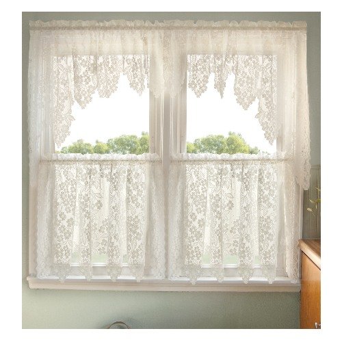 Heritage Lace Dogwood 70-Inch wide by 38-Inch drop White Swag Pair. These intricately-detailed window dressings have a lovely all-over motif of stylized dogwood blossoms against a sheer lace background. Machine wash. Made in the U.S.A.