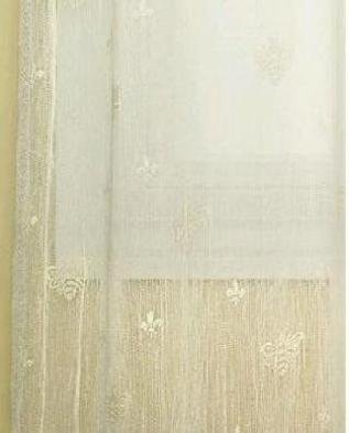From Heritage Lace comes the "Bee" Sheer Panel; Curtain, 45" wide by 96" long and White in color. Fine crushed lace lends subtle texture to these charming window treatments; bee and fleur-de-lis motifs lend them the appeal of Country French décor. 100% polyester and machine washable. This Heritage Lace Bee 45 x 96" Sheer Panel With Trim White is brand new in the original package. This is for the Sheer Panel Curtain only.