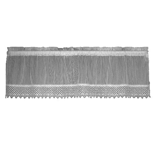 Chelsea 48-inch wide by 14-inch drop Ecru Valance has a crisp, clean look of pinstripes, made even more inviting with lace trim. Includes 1-inch header, 1-1/2-inch rod pocket, and 3-3/4-inch Hem trim in the stated dimensions.