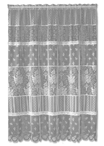 • The look of vintage laces pieced together, defined by grosgrain ribbon or cluny lace trim. Three distinct lace designs are woven into a single curtain panel with stylish transitions of cluny lace and grosgrain ribbon between them. Machine wash.