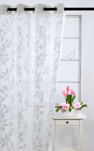 Alibi is a beautiful sheer window panel with opaque white leaves and vines. Alibi's window panel dimensions are 56 by 88-inch. Alibi is hung with decorative grommets. Alibi will decorate your windows with style.