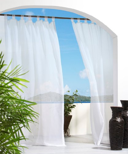 An indoor/outdoor reversible Voile. Eight Velcro tabs. 2.25-3" tabs - therefore panel length varies slightly .25" side hems 56"Width .25" bottom hem Specially designed for use indoors or outdoors Outdoor use as Outdoor Curtains, Outdoor TabTop Curtains for Pergola Curtains or Cabana Curtains Create your own outdoor living space with Escape Reversible Velcro Tab Top Curtain Panels Rod & Hardware Suggestion: Use a decorative curtain rod as seen in the main picture
