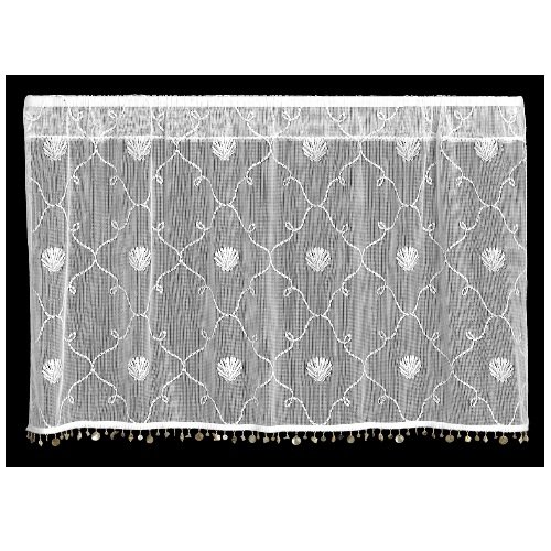 Beach Trellis 42-inch wide by 30-inch drop White Tier with Trim in which the motif is a delicate rope trellis with scallop shell detailing on an airy and light sheer background. It has a 2-1/2-inch rod pocket and a 1-inch natural shell hem trim included in the stated dimension